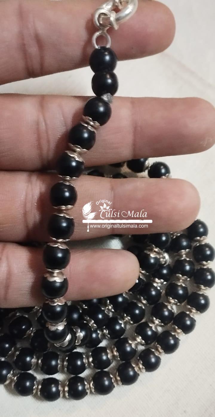 Flower Capped Shyma Black Tulsi Beads Mala In Silver