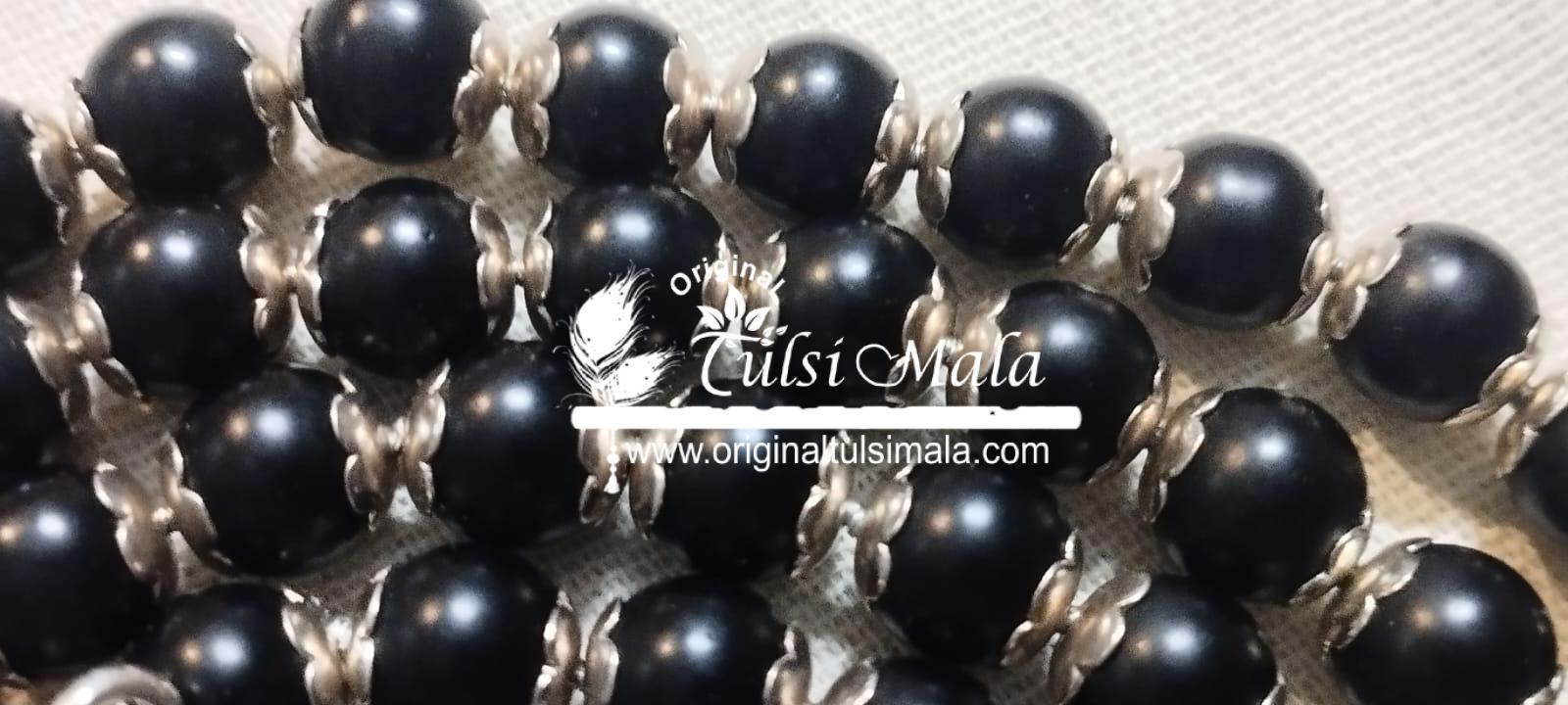Flower Capped Shyma Black Tulsi Beads Mala In Silver