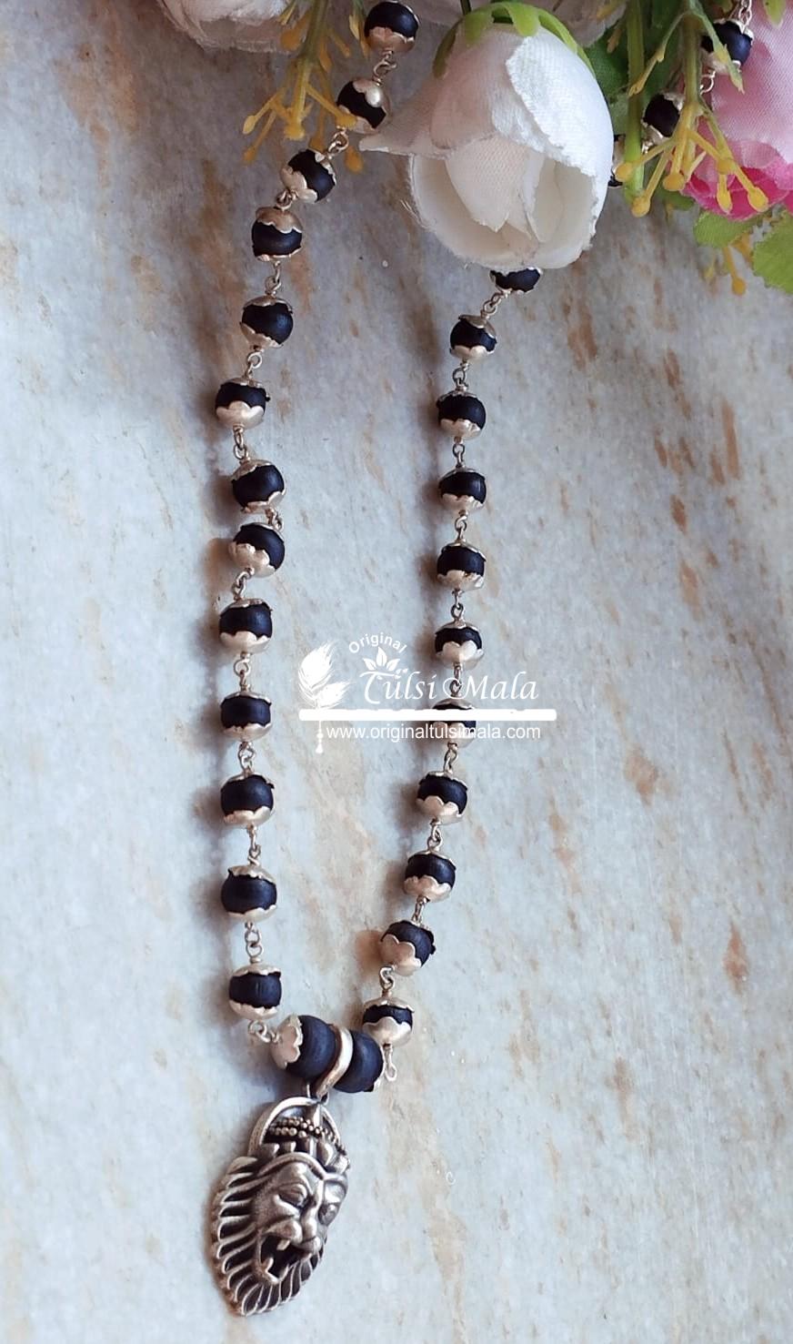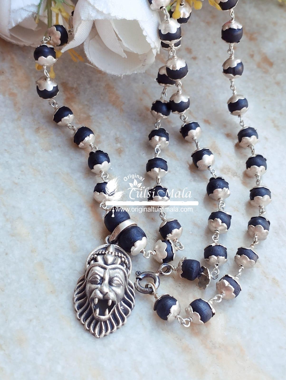 Narsingh Bhagwan Silver Locket With Silver Flower Cap Tulsi Beads Mala