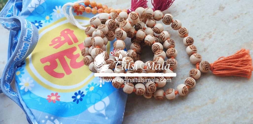 Radha Carved ,12 mm Shyama Tulsi beads Japa mala with Gomukhi and Sakshi mala
