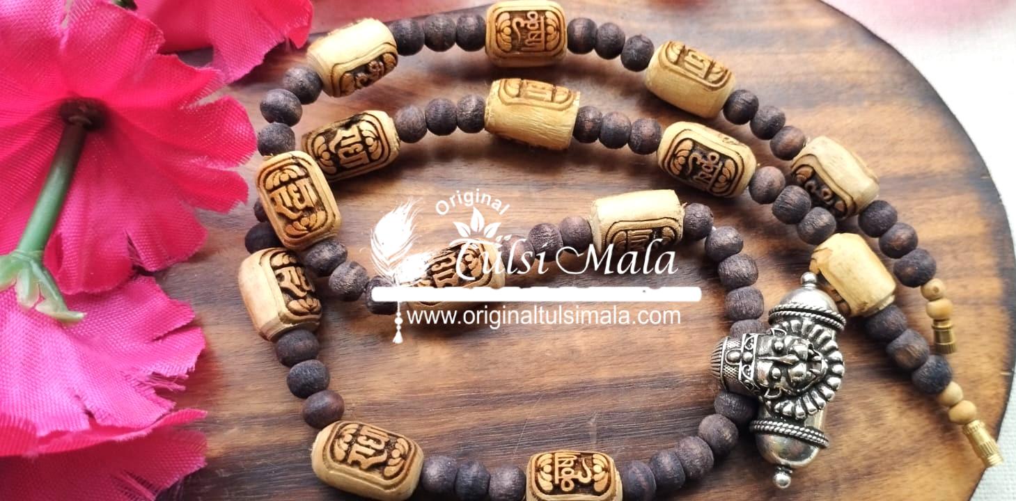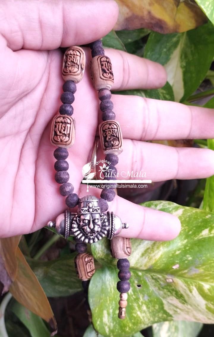 Silver Narsimha Kavach with Radha Krishna Carved Original Tulsi Beads Mala