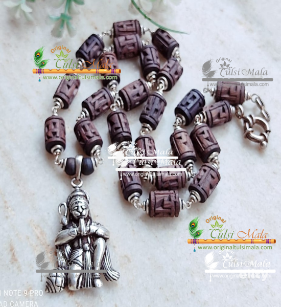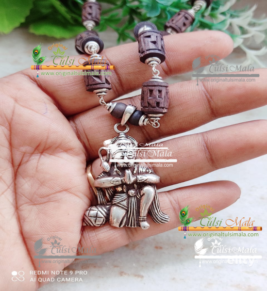 Tulsi Ram Carved Beads Silver Kanthi Mala With Silver Hanuman Ji Locket Pendent